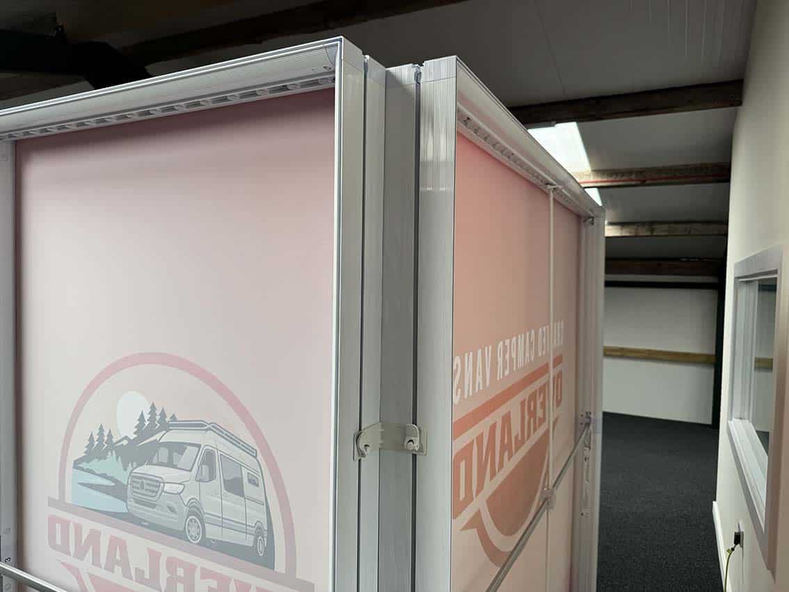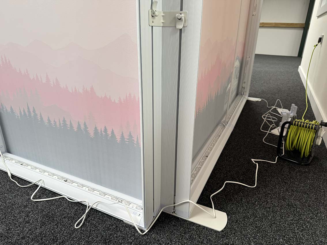 Each aluminium frame lightbox features push-fit fittings and connectors for tool free assembly, making setup and takedown quick and straightforward. The modular system supports fabric lightboxes that span multiple sections, allowing your graphics to flow continuously across the entire wall.